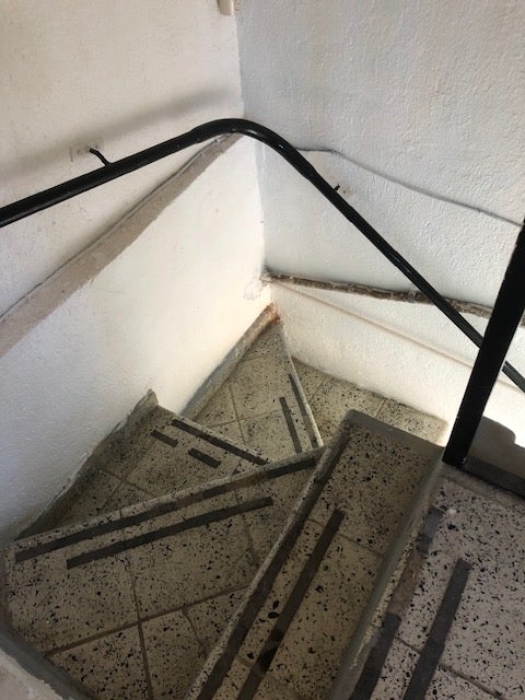 Quiet cobblestone street, NO hills. One flight of stairs up from street.