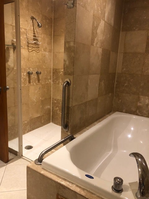 Master bedroom has a king bed, TV, large walk-in closet and ensuite large marble bath with tub and separate shower.